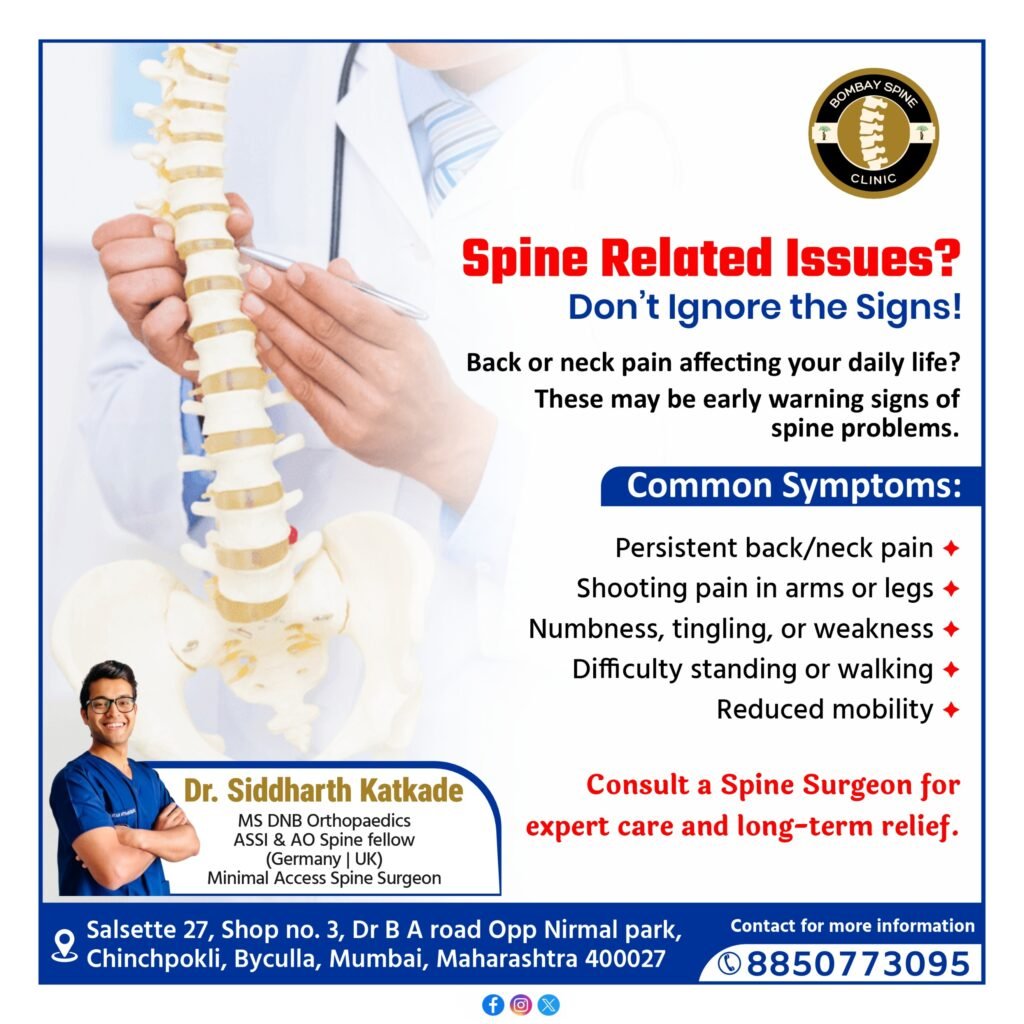 Back or neck pain can deeply affect your routine, productivity, mobility, and overall quality of life. Ignoring early symptoms often leads to more severe spine conditions. At Bombay Spine Clinic, Byculla, Mumbai, Dr. Siddharth Katkade offers advanced, evidence-based spine care for long-term relief. Whether you’re dealing with persistent pain, tingling sensations, or difficulty walking, timely diagnosis is the key to recovery.